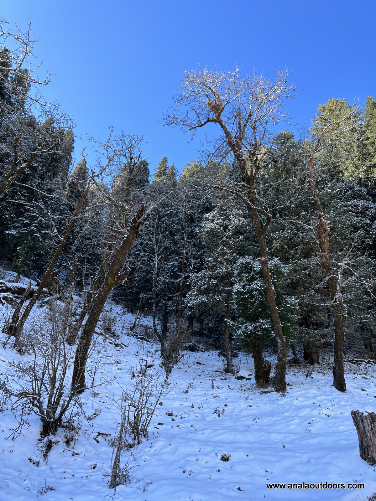 Scenic Beauty: The trek is renowned for its stunning landscapes, which include dense pine and oak forests, open meadows, and snow-covered paths. During winter, the entire trail is blanketed in snow, adding to the magical experience. The clear night skies during the trek are perfect for stargazing.